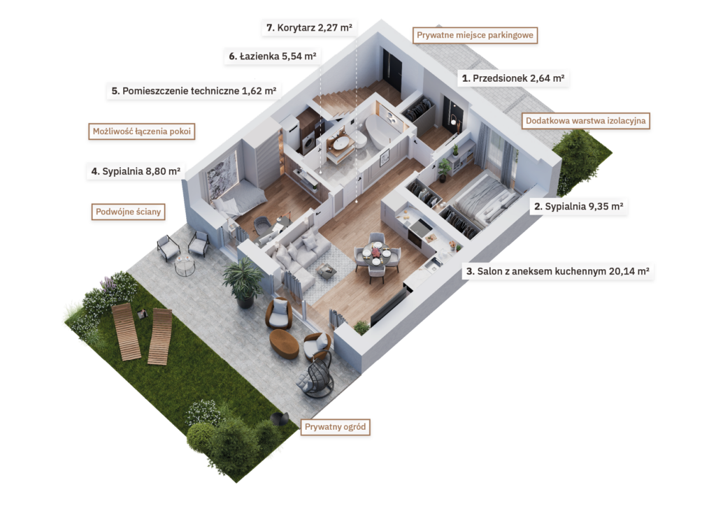 Osiedle zostało zaprojektowane z myślą o oszczędnościach – zastosowanie energooszczędnych technologii, takich jak pompy ciepła czy pakiety okienne minimalizujące straty ciepła, sprawia, że koszty utrzymania bezczynszowych apartamentów są wyjątkowo niskie. Wnętrza mieszkań zapewniają również komfortową ciszę – podwójne ściany między budynkami znacząco poprawiają izolację akustyczną, zapewniając spokojną atmosferę w każdym pomieszczeniu.